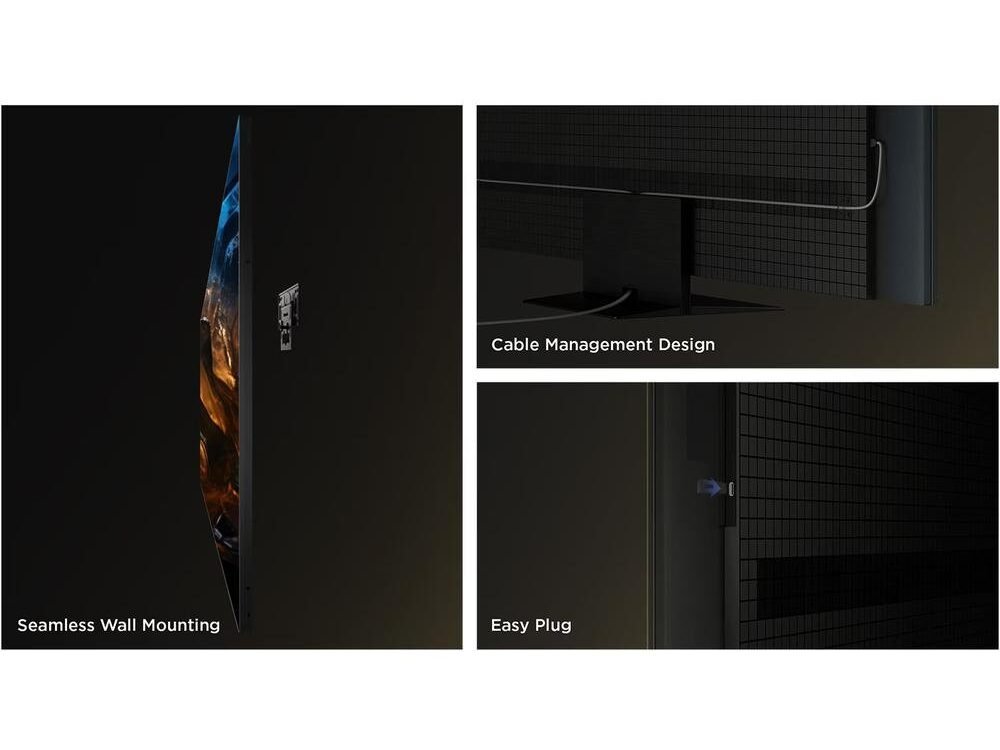 Het design is strak en modern met een ultradun profiel van slechts 56 mm, metallic afwerking en naadloze afwerking aan de achterzijde. De tv meet 144,7 × 83,2 × 5,6 cm zonder voet en 144,7 × 89,4 × 36,9 cm inclusief voet, met een VESA-montagemaat van 300 × 300 mm. Het gewicht bedraagt circa 17 kg zonder voet.