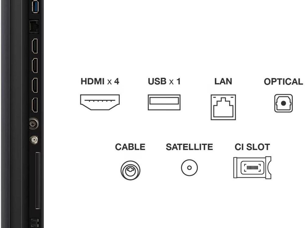 Op aansluitgebied biedt de tv vier HDMI-ingangen (inclusief HDMI 2.1 met eARC, VRR en ALLM), een USB 3.0-poort, optische uitgang, LAN-aansluiting, CI+-slot en ingebouwde wifi en Bluetooth. Zo sluit je moeiteloos consoles, mediaspelers en soundbars aan.