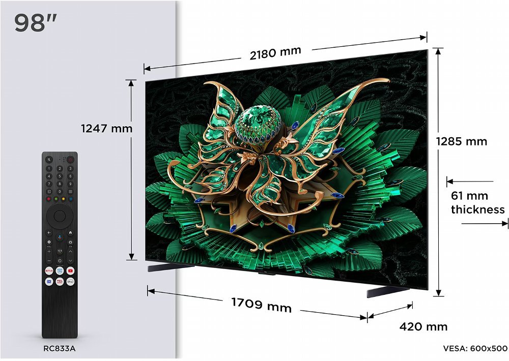 Het ontwerp van de TCL 98Q7C onderstreept de moderne techniek met een slanke afwerking en vrijwel randloos scherm dat perfect past in grote woonkamers of dedicated home-cinema setups. Of je deze televisie nu op een meubel plaatst of met een VESA-bevestiging aan de muur hangt, hij biedt een sterke combinatie van een groot schermformaat, indrukwekkende beeld- en geluidskwaliteit, slimme functies en veelzijdige connectiviteit. Daarmee is de TCL 98Q7C een uitstekende keuze voor iedereen die regelmatig kijkt naar films, series, sport, games en streamingdiensten op een groot display.