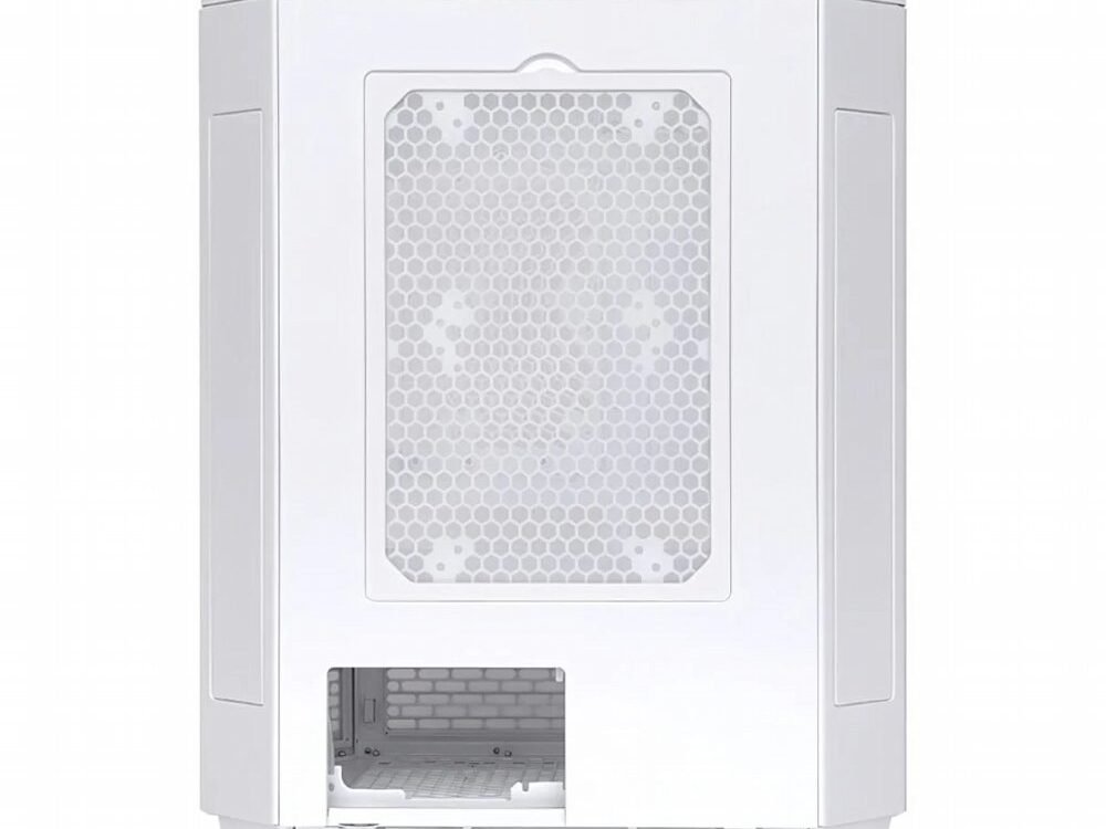 De Thermaltake The Tower 600 Snow is een ATX mid tower behuizing met een opvallende achthoekige prismavorm die compatibel is met moderne moederborden met verborgen connectoren. Het unieke verticale ontwerp biedt plaats aan zowel een 420 mm AIO radiator aan de rechterzijde als een 360 mm radiator aan de linkerzijde, en ondersteunt tot dertien 120 mm of negen 140 mm ventilatoren.