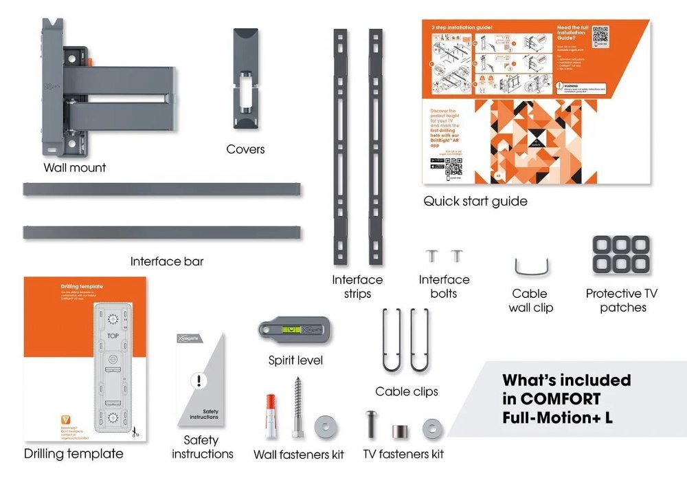 De COMFORT Full-Motion+ tv beugel is eenvoudig te installeren. Zo worden een boormal, schroeven, fischer® DuoPower pluggen, kabelbinders en een waterpas meegeleverd. Het eerste boorgat teken je eenvoudig af met onze gratis DrillRight app. Hangt je tv een tikje scheef? Geen probleem. Ook na installatie hang je hem nog eenvoudig waterpas.