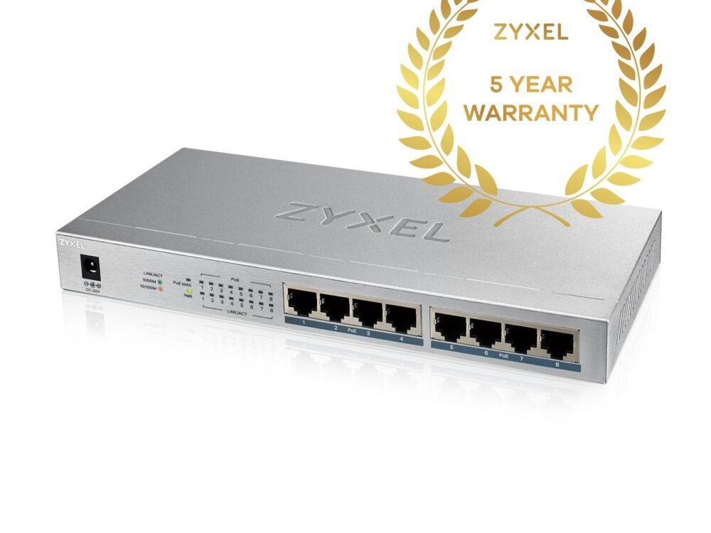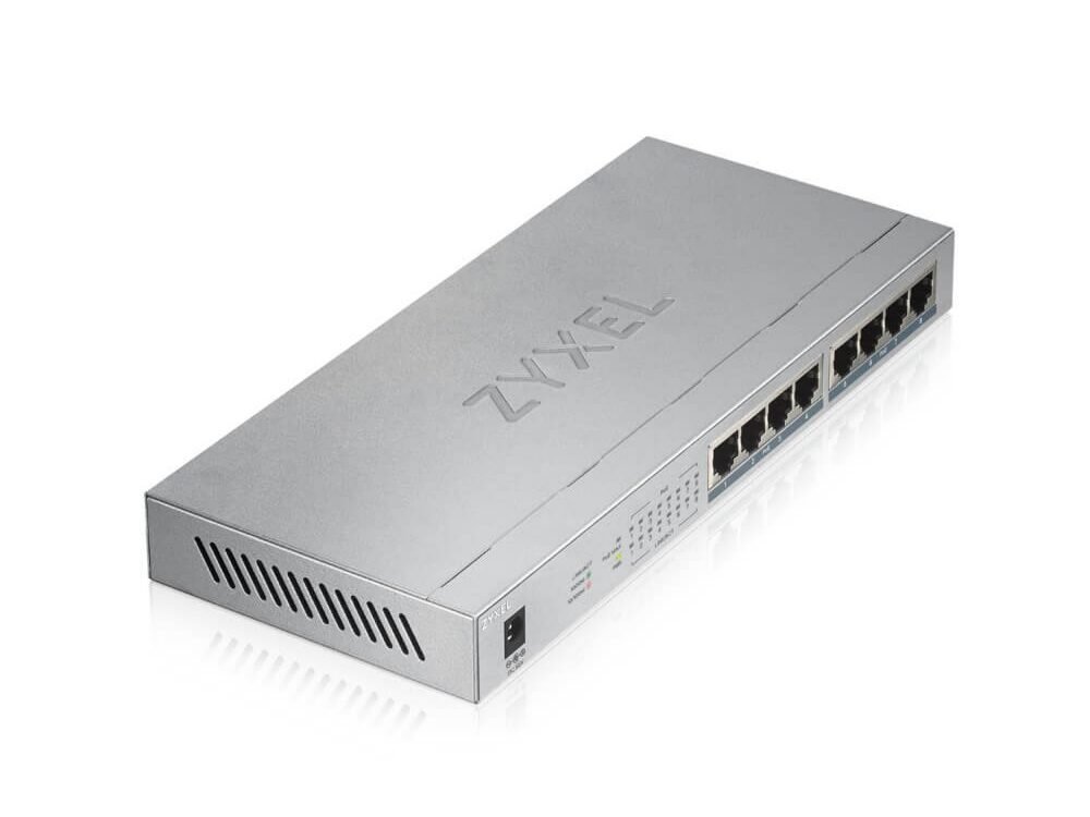 De Zyxel GS1008HP 8-poorts gigabit PoE+ switch ondersteunt 802.3af en 802.3at PoE+.